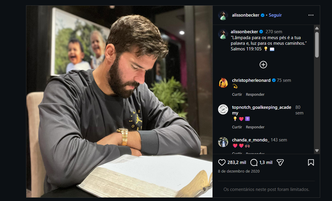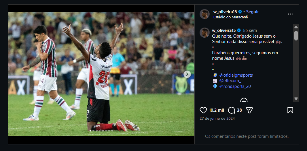 “Deus quer o nosso coração, Ele não quer que a gente entregue a Ele somente as coisas que nos convêm… entrega o teu caminho a Ele e você vai ver a mão de Deus sobre a sua vida de uma forma que nunca viu antes. Eu provei disso e hoje eu não consigo mais viver sem a presença de Deus, sem buscá-lo em primeiro lugar, porque esse é o mais importante. Seja fiel e obediente à Palavra de Deus, que Ele faz coisas que você nem imagina na sua vida”, escreveu o jogador.