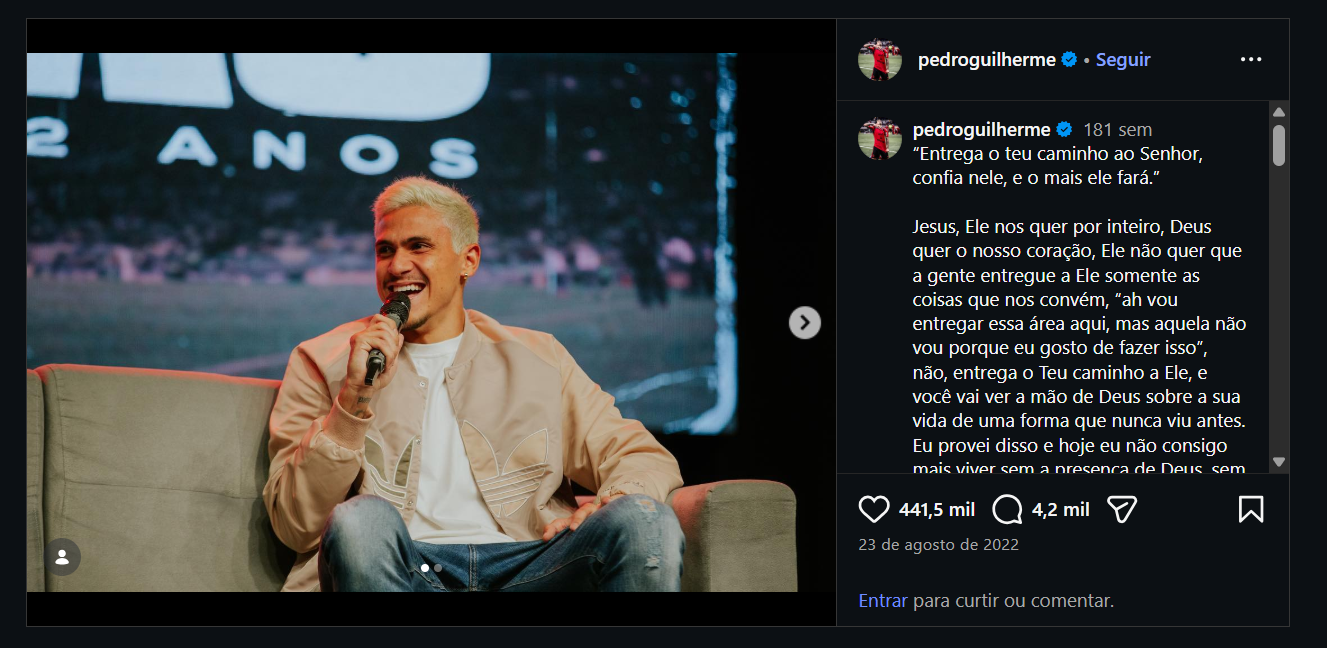 Em seu perfil no Instagram, após participar do Culto dos Atletas na Igreja Batista Atitude, no Rio de Janeiro, Pedro compartilhou uma mensagem sobre entrega e fidelidade a Deus: